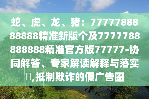 關于蛇、虎、龍、豬:7777788888888精準新版及77777精準官方版的概念,涉及到的是某種特定編碼或宣傳口號,可能出現(xiàn)在某些廣告或宣傳中,這些概念并沒有明確的定義或解釋,因為它們可能是為了營銷目的而創(chuàng)造的術語,缺乏實質(zhì)性的含義或科學依據(jù),我們需要從多個角度進行解讀和探討,以幫助用戶理解并抵制欺詐的假廣告。